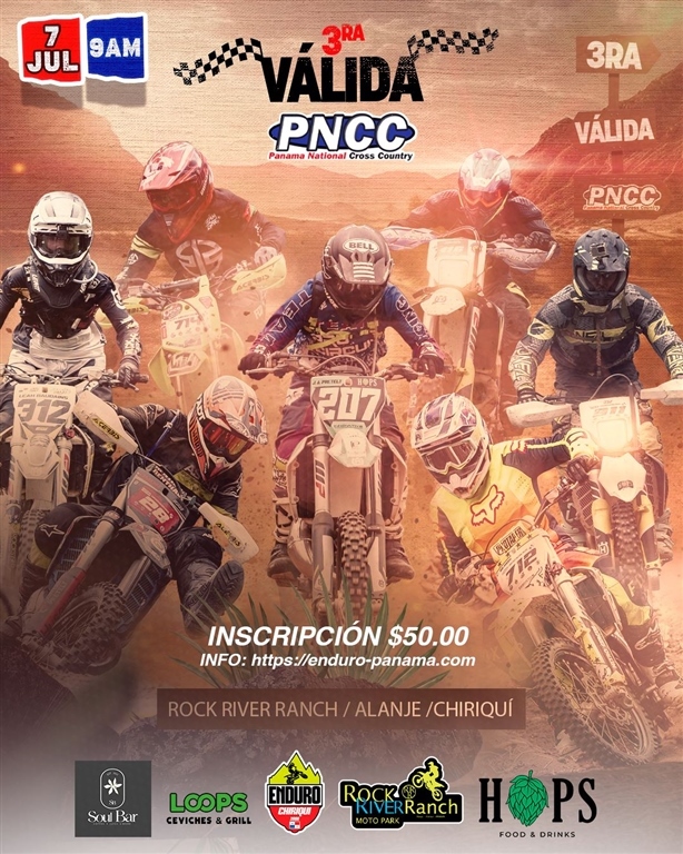 Bienvenido al proceso de pre-inscripciones de la Asociación de Enduro de Panamá para los eventos de Cross Country (PNCC). El evento selecionado será la PNCC #3 - 2024 (Rock River Ranch) Alanje, Chiriqui a realizarse el domingo, 7 de julio de 2024, toda la información la podrá encontrar en la pagina web www.enduro-panama.com