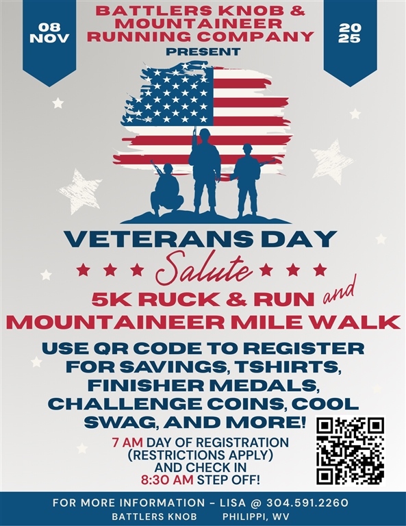 MOUNTAINEER RUNNING COMPANY is honored to direct the Second Annual Battlers Knob Veterans Day Salute 5k Ruck & Run! Per WV Governor Morrisey's health initiative, we will also be offering a 1 mile "Mountaineer Mile" walk. This is a challenging course with lots of spirited competition, some awesome swag, and family fun! A virtual option has been added this year, so that you can participate even if you can't make it to the race!