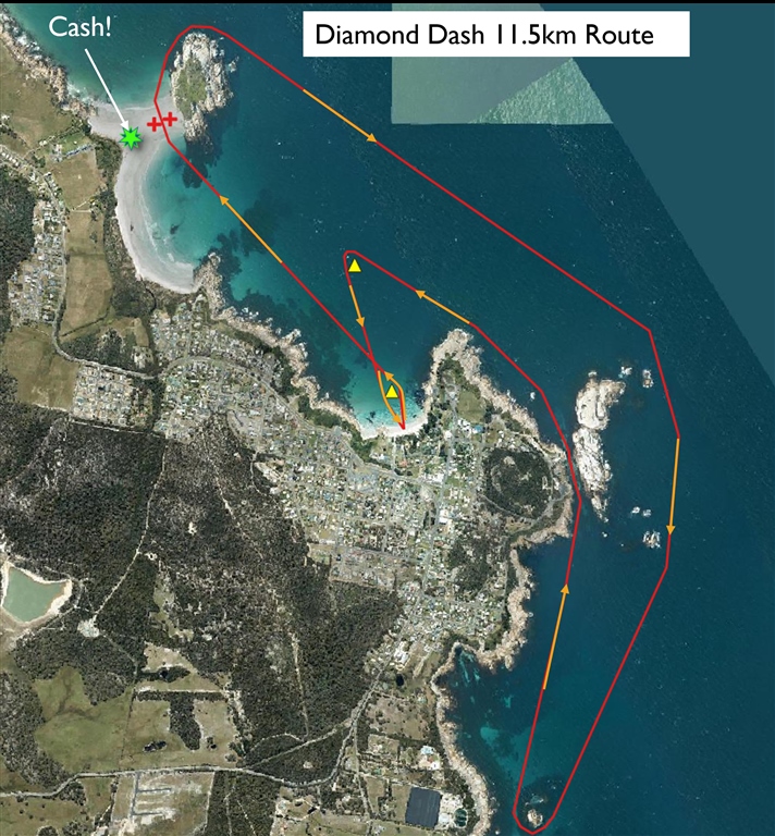 The Dash will take competitors on a route from Waubs Beach around Diamond Island and across Waubs Bay to the Gulch. Competitors will paddle through the Gulch, heading south around Muirs Rock before returning north to Waubs Beach via the Gulch.