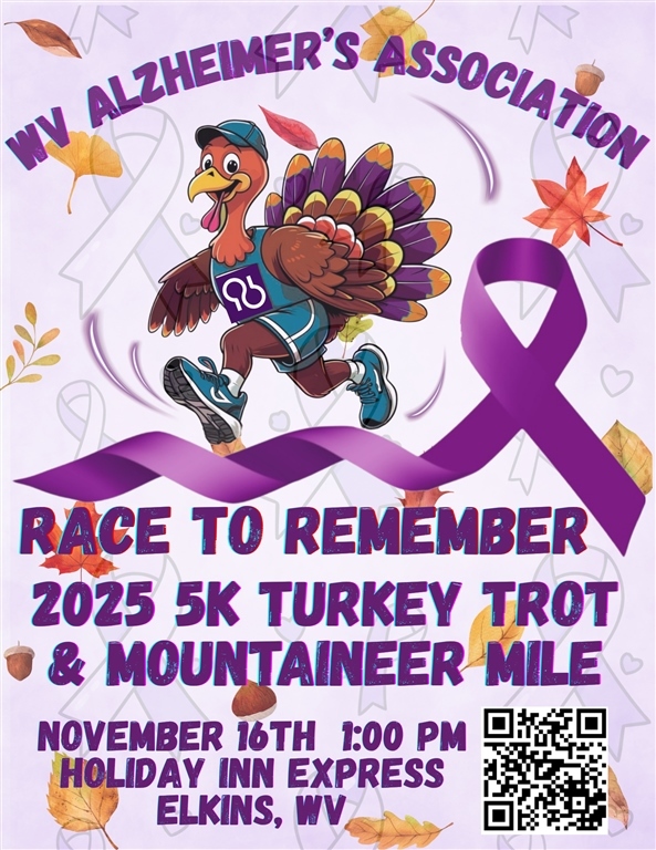 This Race to Remember 5K Turkey Trot and Mountaineer Mile Walk is being held to raise funds for and awareness of Alzheimers disease in WV. Various sponsors and information stations will be available before, during, and after the Race.