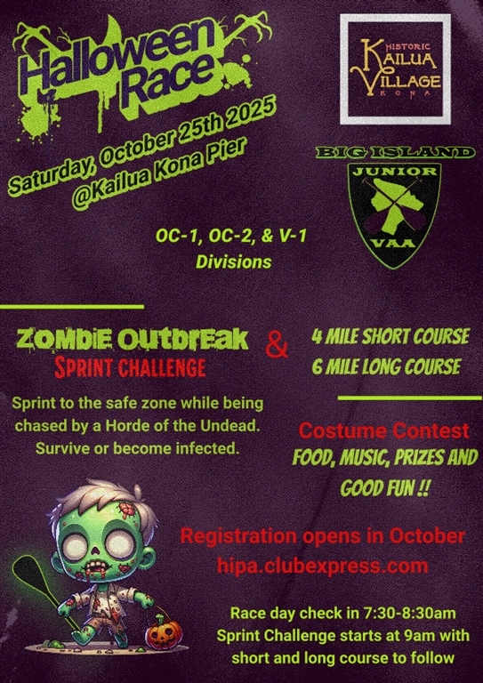 The Big Island Junior Va'a Halloween Race will be held on Saturday October 25th at the pier in Kailua Kona.