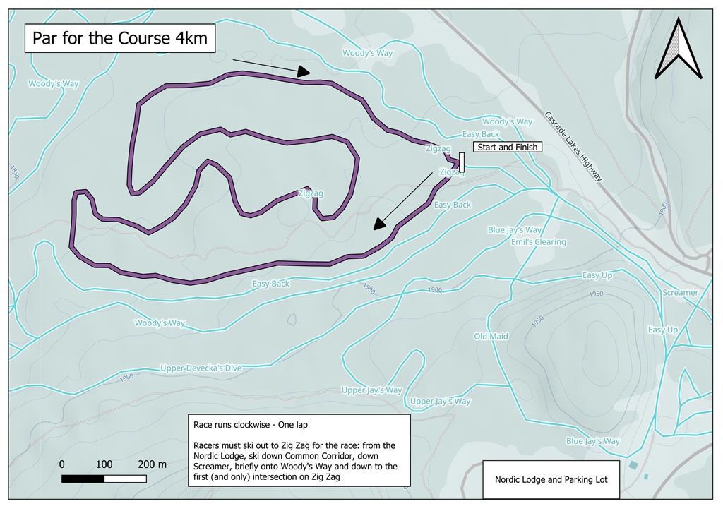 The course is the Zig-Zag trail run clockwise. The start and finish are at the Zig-Zag loop. To access the start and finish you will need to ski down from the lodge to intersection 9 and then down the Zig-Zag access trail to the loop start. Racers must have a Mt. Bachelor Pass, as well as be registered to race by the Friday at 5 pm of that week. You can register for one or both Par races.