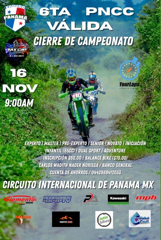 Bienvenido al proceso de pre-inscripciones de la Asociación de Enduro de Panamá para los eventos de Cross Country (PNCC). El evento selecionado será la PNCC #6 - 2025 (CIP MX) Chorrera a realizarse el Sunday, November 16, 2025, toda la información la podrá encontrar en la pagina web www.enduro-panama.com