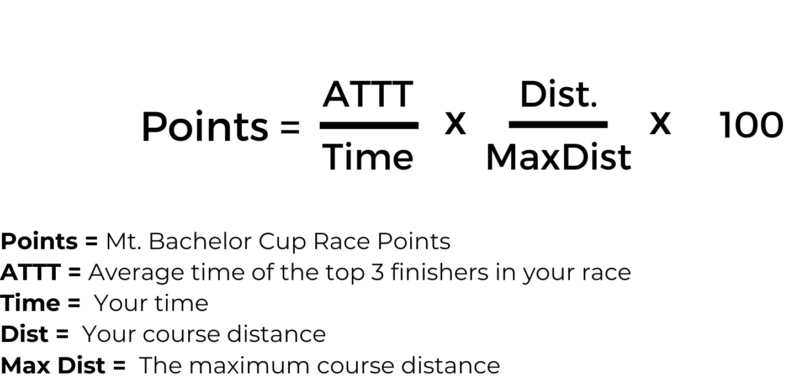 Mt. Bachelor Cup points will be awarded to everyone who finishes a race. Points are calculated by taking your race time and dividing by the average time of the top 3 finishers in your race. For the longest race course the result will be multiplied by 100. For shorter races, the result will be multiplied by the ratio of your race distance divided by the distance of the longest race. Men and women points will be calculated separately. For determining overall end-of-season Mt. Bachelor Cup winners, each person score will be calculated from the combined total races, regardless of how many races each participant completes.