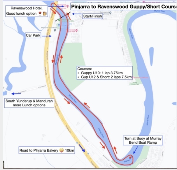 Start at Ravenswood. Paddle downstream and turn under the Ravenswood Bridge. Then paddle upstream around the buoy placed off the end of the jetty at the Murray Street Boat Ramp and back to the start point.